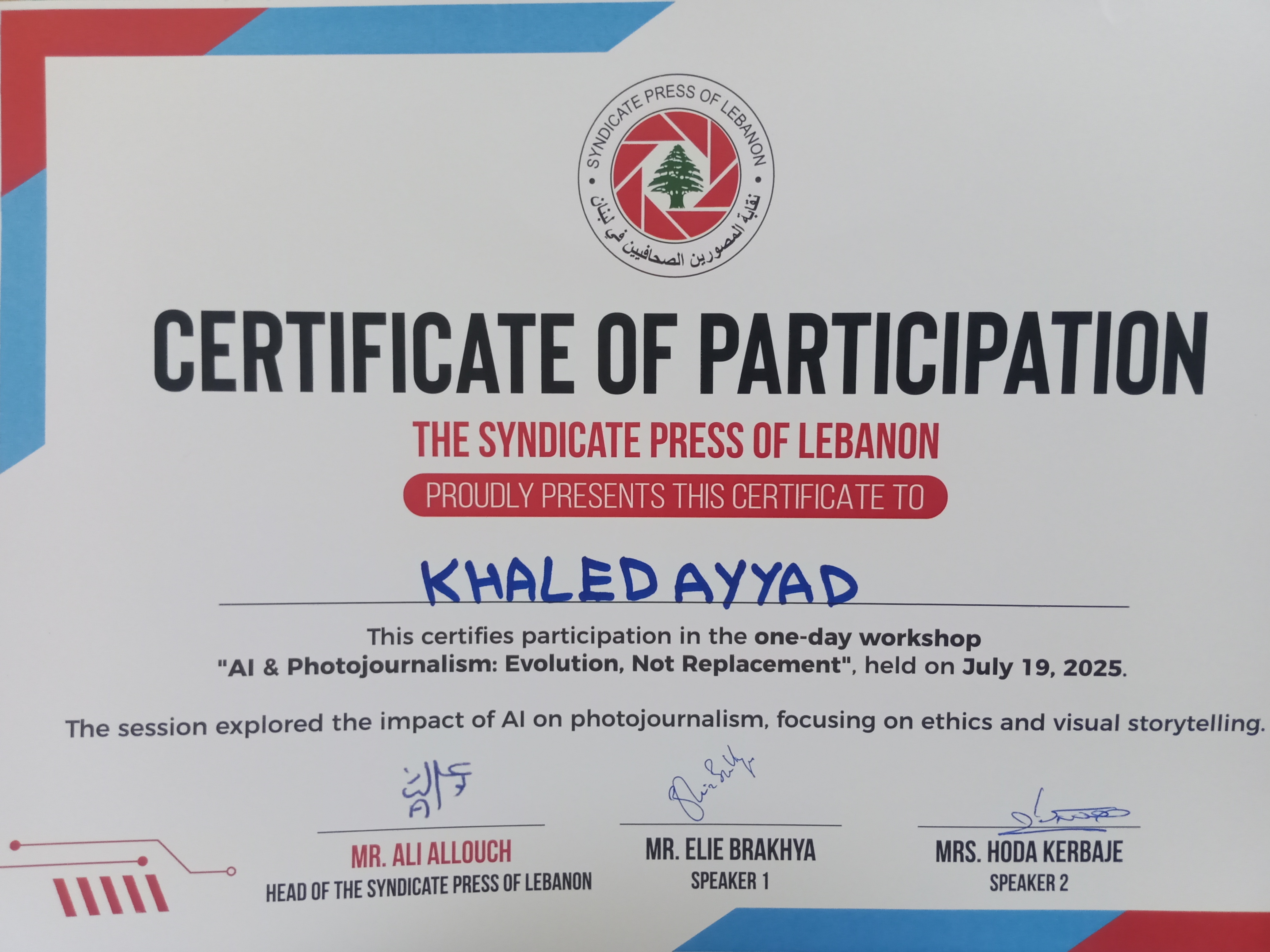 قاد الورشة كلّ من الزميل المصوّر إيلي براخيا والمخرجة هدى كرباج، وطرحا مجموعة من المفاهيم والتقنيات المتصلة بأدوات الذكاء الاصطناعي، وكيفية توظيفها في خدمة العمل التصويري من دون المساس بروح الصورة أو دور المصوّر الإبداعي. وقد لاقت الجلسات تفاعلاً واسعًا ونقاشًا مهنيًا غنيًا، عكس مدى انفتاح المصوّر اللبناني على كل ما هو جديد، وسعيه المستمر لتطوير أدواته ومهاراته.