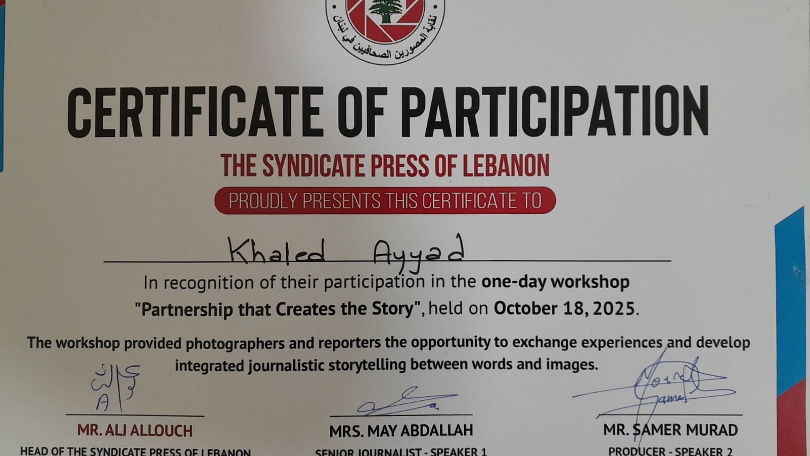 وفي ختام الورشة، تم توزيع شهادات المشاركة على الزملاء المصوّرين المشاركين، حيث وجّه المصوّر الصحافي خالد عياد التهنئة للزملاء على جهودهم وتفاعلهم، متوجهًا بالشكر والتقدير إلى النقيب علي علوش على دوره القيادي في دعم المصورين وتطوير مهاراتهم، وإلى الزميل زهير قصير الذي وصفه بـ “الجندي المجهول” في النقابة، مشيرًا إلى أن النقيب علوش يلقّبه دائمًا بـ”القائد” تقديرًا لعطائه وإخلاصه.