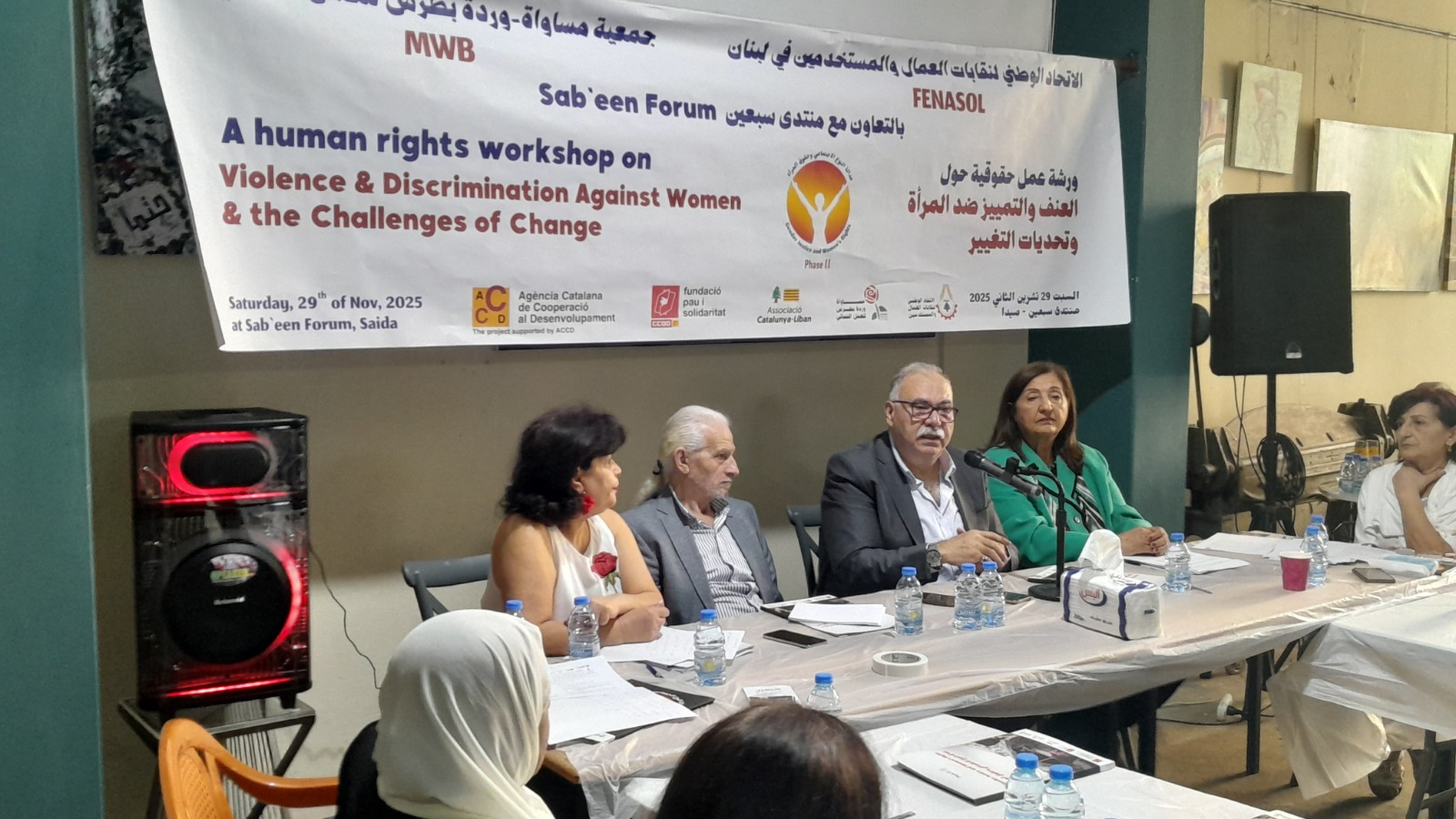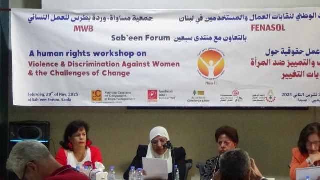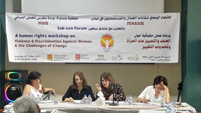 بمناسبة حملة ” مناهضة العنف ضد المرأة”، واليوم العالمي للتضامن مع الشعب الفلسطيني، وبدعوة من الاتحاد الوطني لنقابات العمال والمستخدمين في لبنان وجمعية مساواة – وردة بطرس للعمل النسائي ضمن سلسلة ورش عمل لتعزيز الحملة الوطنية من أجل ضمان عدالة النوع الاجتماعي وحقوق المرأة والتصديق على اتفاقية منظمة العمل الدولية 190 للقضاء على العنف والتحرش في اماكن العمل، اقيمت يوم أمس في مدينة صيدا – وبالتعاون مع منتدى سبعين ورشة عمل حقوقية حول : العنف والتمييز ضد المرأة وتحديات التغيير،بمشاركة حشد من الاتحادات والهيئات النقابية والنسائية اللبنانية والفلسطينية، وفعاليات حقوقية واعلامية واجتماعية من صيدا والجنوب.