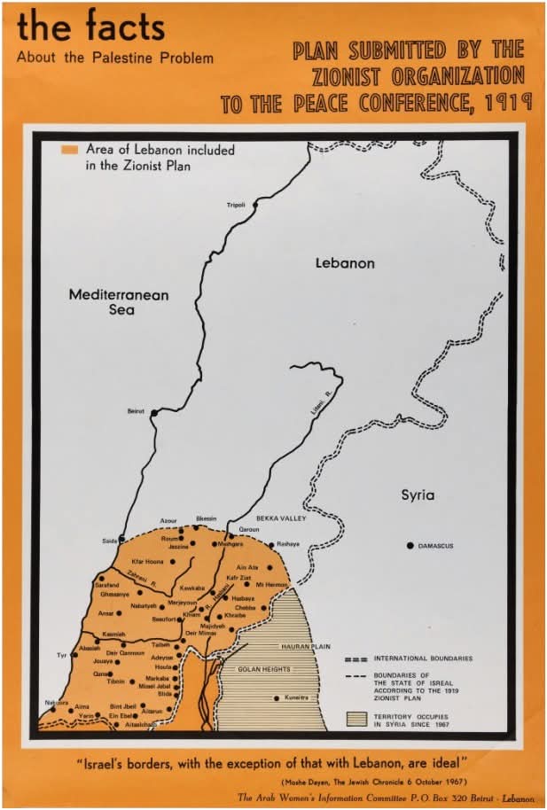 (٢) – راجع الخريطة التي حملها وفد المنظمات الصهيونية العالمية إلى مؤتمر باريس الذي عقد في العام 1919، بعيد انتهاء الحرب العالمية الأولى والتي يطالب فيها الصهاينة بضم الجنوب والبقاع الغربي كاملين للكيان، بدءاً من صيدا طلوعاً إلى عازور وبكاسين ووصولاً إلى القرعون وجبل الشيخ. والخريطة موجودة في أرشيف الحرب العالمية الأولى في باريس، كما تتواجد نسخة منها في المتحف الفلسطيني.